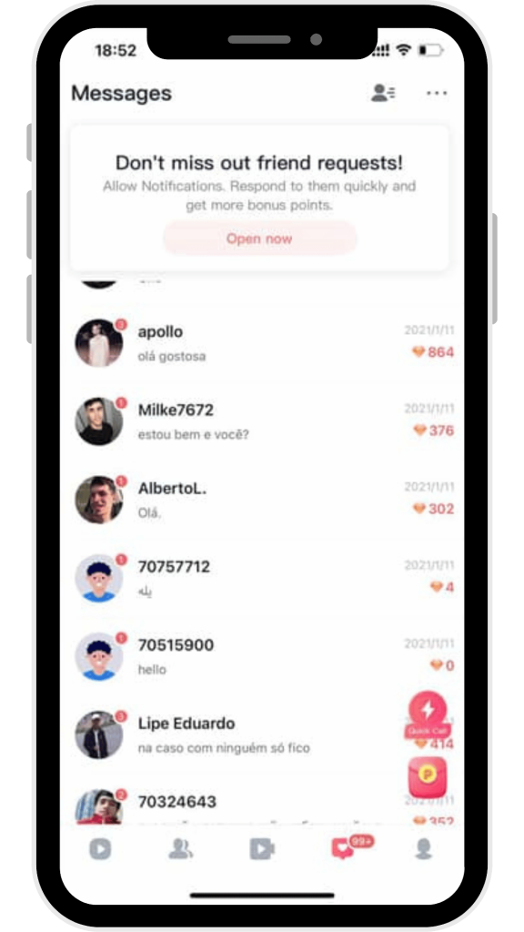 É um aplicativo móvel online no qual você ganhará dinheiro simplesmente conversando com outras pessoas. Comunique-se por meio de chamadas de vídeo e áudio. Troque mensagens de voz e texto. Compartilhe fotos. Entre ao vivo. Receba presentes e ganhe pontos por tudo isso! Então os pontos são convertidos para USD